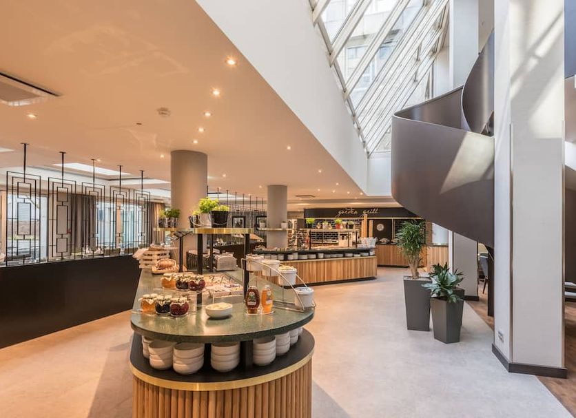 The Garden Grill restaurant is located at the hotel and serves a fresh breakfast every morning. There are also beverages available all day long in the Lobby Bar. The Pavillion Pantry is open 24/7 and sells drinks, snacks, and other items guests may need. The hotel also has room service in the evening hours. During the evening hours, the restaurant serves international and German cuisine along with vegetarian and vegan options.